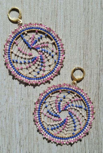Voeg een vleugje kleur en karakter toe aan je look met deze unieke handgemaakte oorbellen van 5 cm doorsnee. De ronde gouden ring is kunstig versierd met een spiraalvormig patroon van roze, blauwe en witte kralen, verweven met fijn draadwerk. De buitenrand schittert met diverse miyuki kraaltjes die zorgen voor een speelse en opvallende uitstraling.